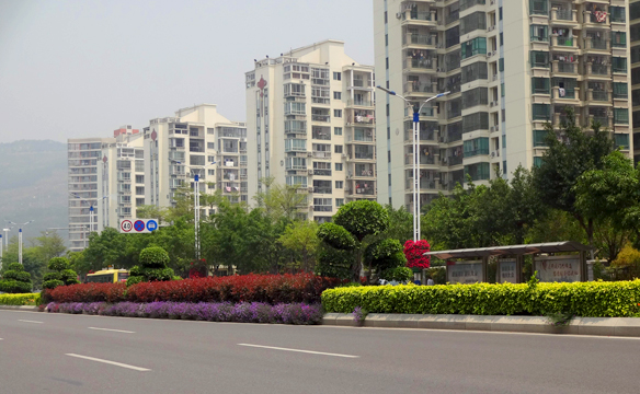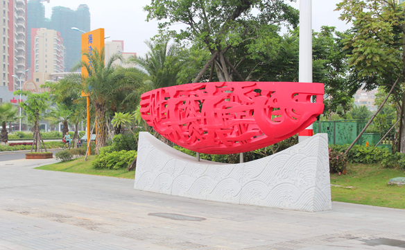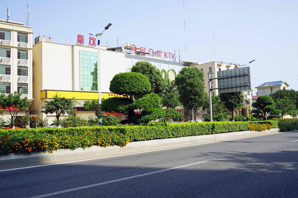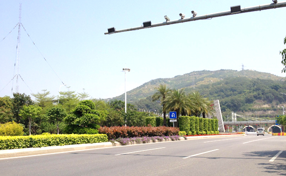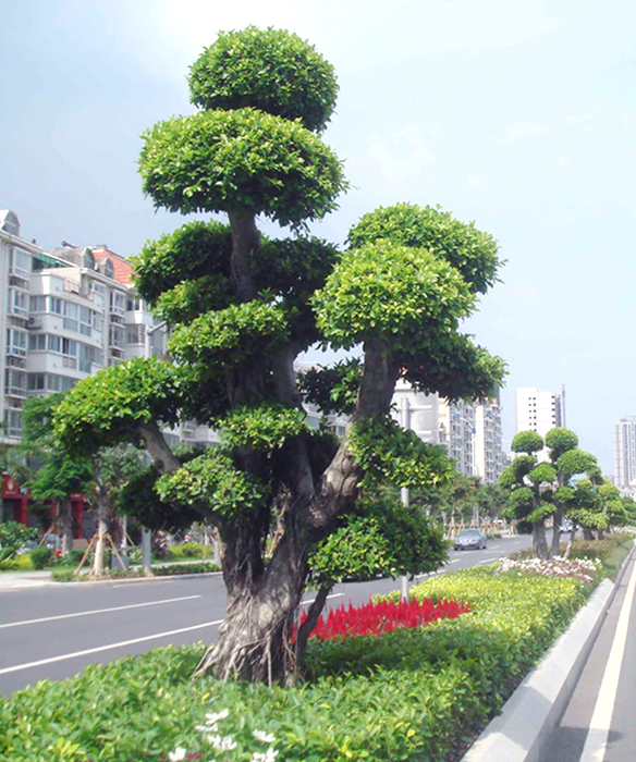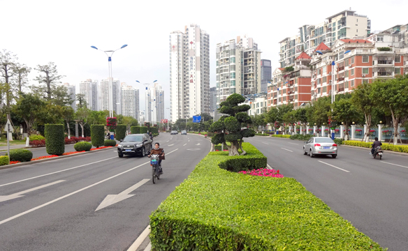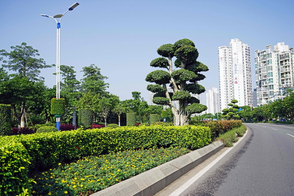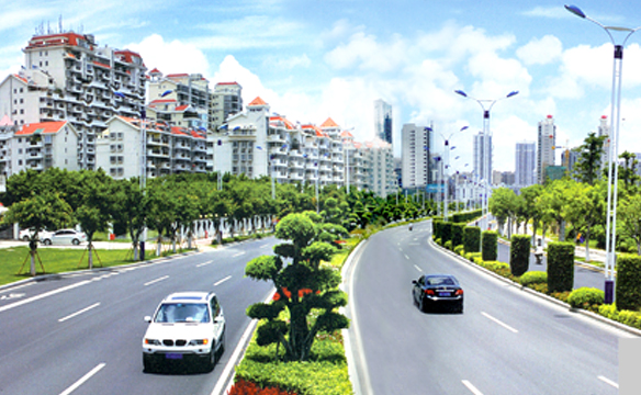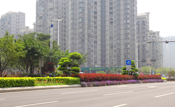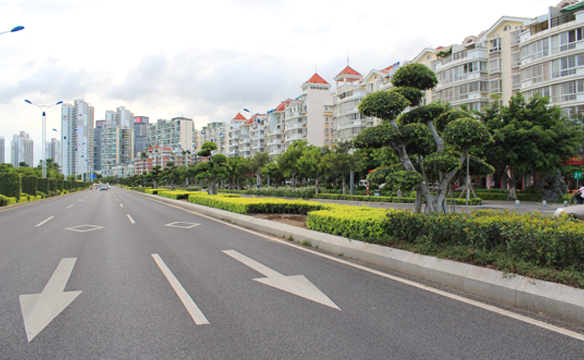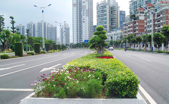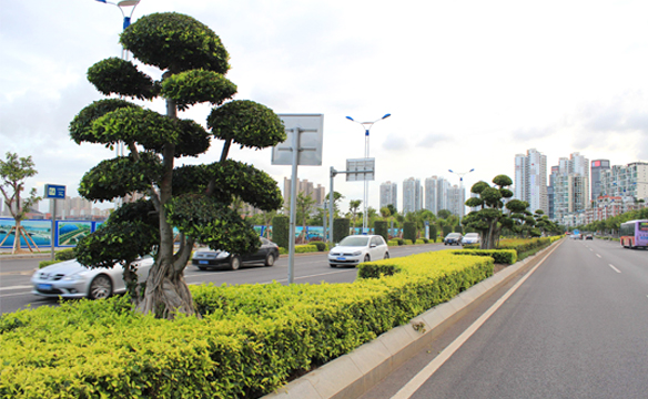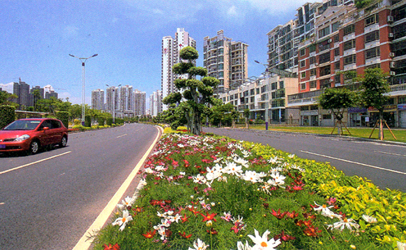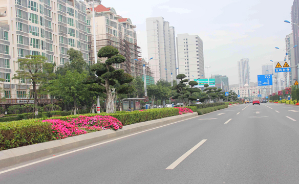 迎宾大道是进入海沧新城的门户,建成后,绿化景观处处让人感受到开门迎宾的效果。道路绿化整体上风格统一协调,乔木选择开花色彩艳丽的大花乔木,中分带乔木采用观赏价值高、层次分明的大规格榕树桩景,花灌木采用色彩艳丽的多年生花卉和时令草花,四季鲜花常开,鲜花上路,给人热情、温馨、愉快的舒适感受。重要路口节点增设具有地方特色的雕塑小品,如海沧城雕水景,“船歌”雕塑,“保生大帝”屏风式雕塑,“水世界”雕塑,增强文化艺术气息,为“城在林中、路在绿中、屋在园中、人在景中”的生态海沧增添了一道亮丽风景线。