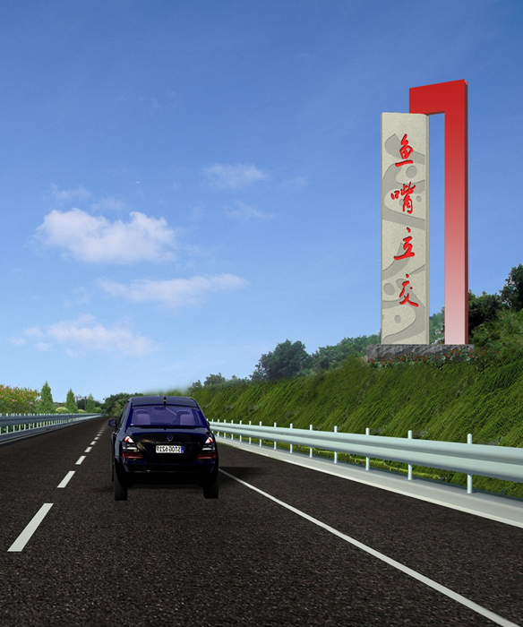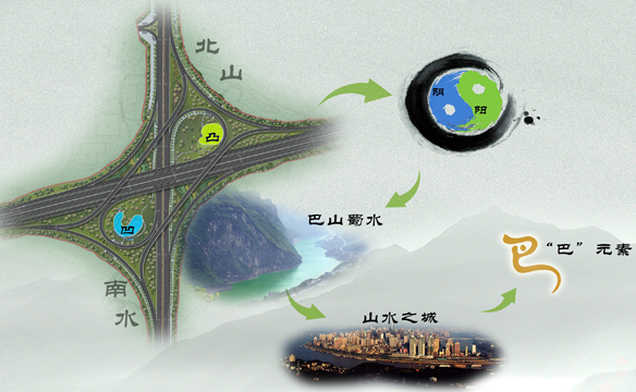 鱼嘴立交的设计根据道路线型、通行容量、观景效果及安全性上存在的问题,对道路的现状进行分析比较和研究,确定以安全为前提,保护原有较好的道路绿化,增强道路环境景观为目标,以“大气、舒适、干净”为设计原则,依照两江新区的总体山水格局,完善城市生态风貌,力图将本道路设计成一条整体性强,视觉景观优美,空间序列丰富,文化底蕴深厚,独具特色的品质景观道路和生态绿色通道,实现人与自然的和谐共生。