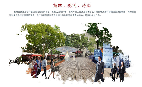 整个设计以简约、现代、时尚为主题,在地面铺装上设计提出简洁现代的手法,具有人流导向性;在两个主入口通过艺术小品不同的材质进行穿插创造动感氛围,同时将立面形象作为视觉穿插的重点,通过活泼的造型语言和明快的色彩带动青春的活力,带来时尚的气息。