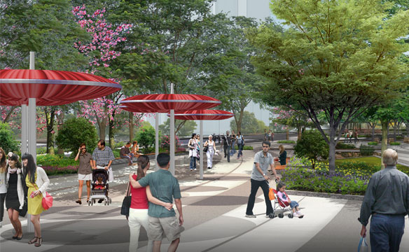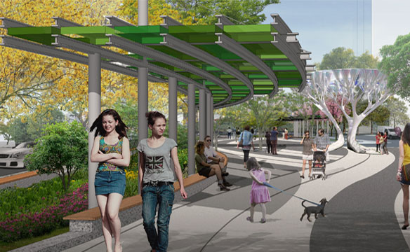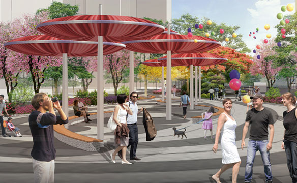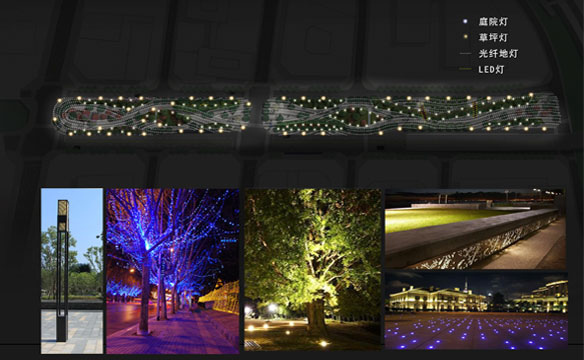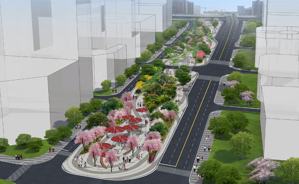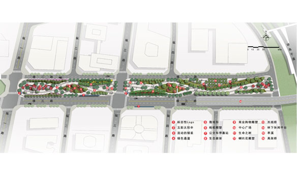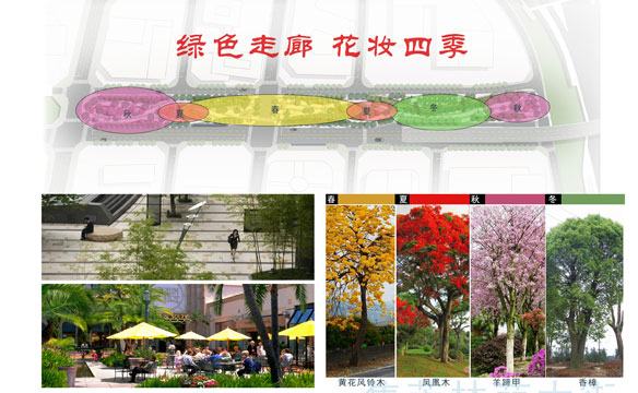 绿化设计以绿色走廊为该地块设计的意向,选择树冠较大的香樟,枝叶舒展的小叶榄仁来营造绿荫环绕的氛围,入口处大片种植羊蹄甲,装点出紫色系的广场,成为吸引人潮的主要入口,在两个广场的中央草坡地带,点缀夏天盛开红彤彤的凤凰木,创造自然色彩丰富的地景效果,利用黄花风铃木、粉花风铃木等,在视觉上创造出丰富多彩的绿地景观,成为拥有独特的绿地景观效果的广场。