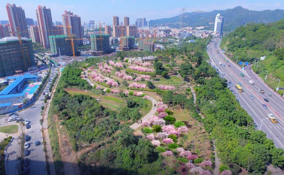 项目规划在山体、溪流等规划建设花海风景林194.5公顷,位于大屏山、蔡尖尾山、龟山公园、海沧农场、天竺山皓月湖、过芸溪流域等地。海沧区花海风景林规划花木品种主要以先花后叶植物为主。先花后叶植物其花、叶、姿态等与其他园林植物相比有更独特的观赏价值,花期往往能给人强烈的视觉冲击,表现出一幅幅繁花似锦的画面,尤其是当某一品种群植时,更能够达到烘托气氛的效果。