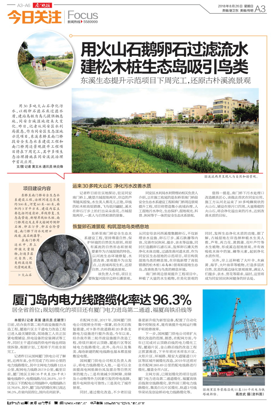 30多吨火山石净化污水,鹅卵石滤石床过滤水质,鳞次栉比的站鸟桩为鸟儿提供栖息地,同安古城湿地迎来大变化。作为同安区生态湿地示范项目,东溪东桥至南门桥段安全生态水系建设工程和南门桥周边景观提升工程项目将在近期完工,其中多项生态治理措施在同安溪流治理中首度应用。