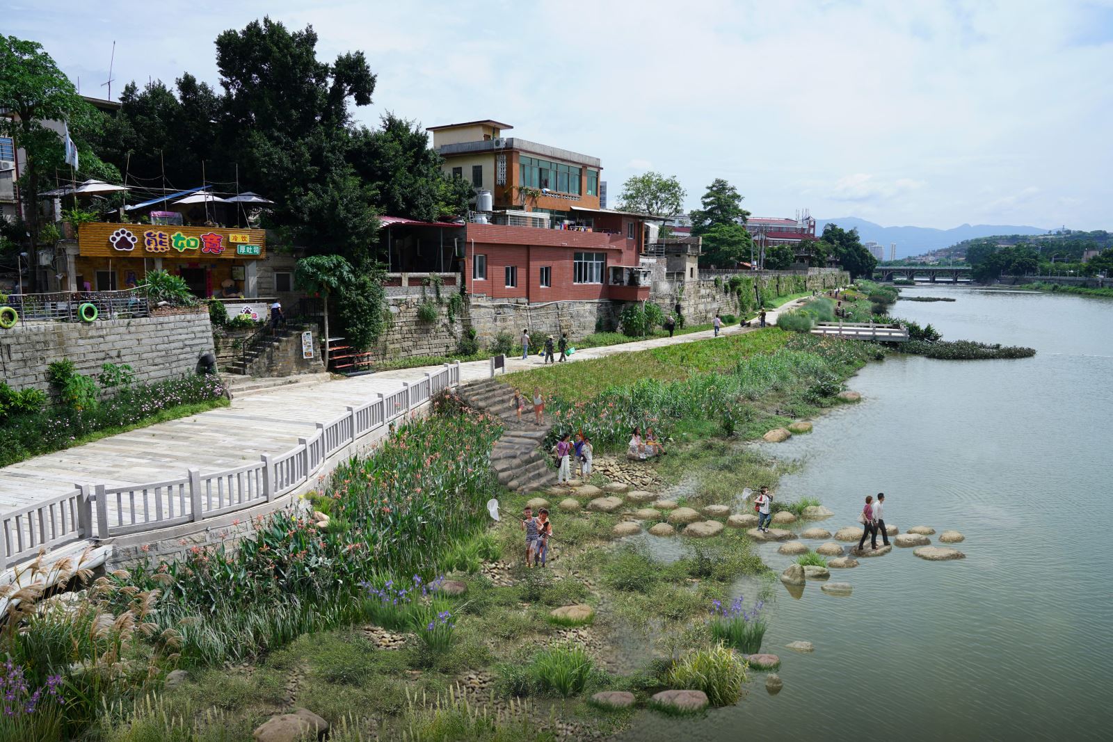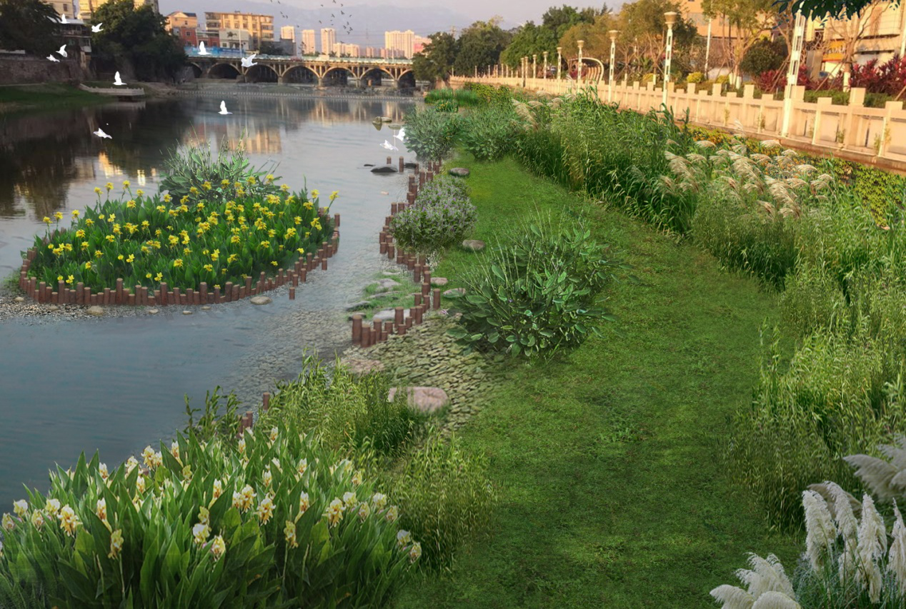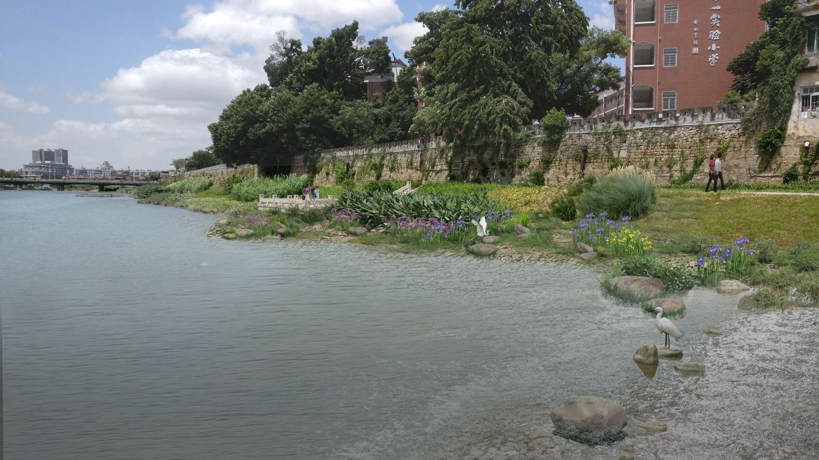 东桥至南门桥安全生态水系建设工程,以尊重自然,保护环境的自然优先原则,将原有溪流的自然形态和景观要素作为古城湿地的特色,以修复河流生态环境、水质改善、景观提升为出发点,让河流恢复生命,流域再现生机,还原儿时记忆中自然、古朴的溪流景观。