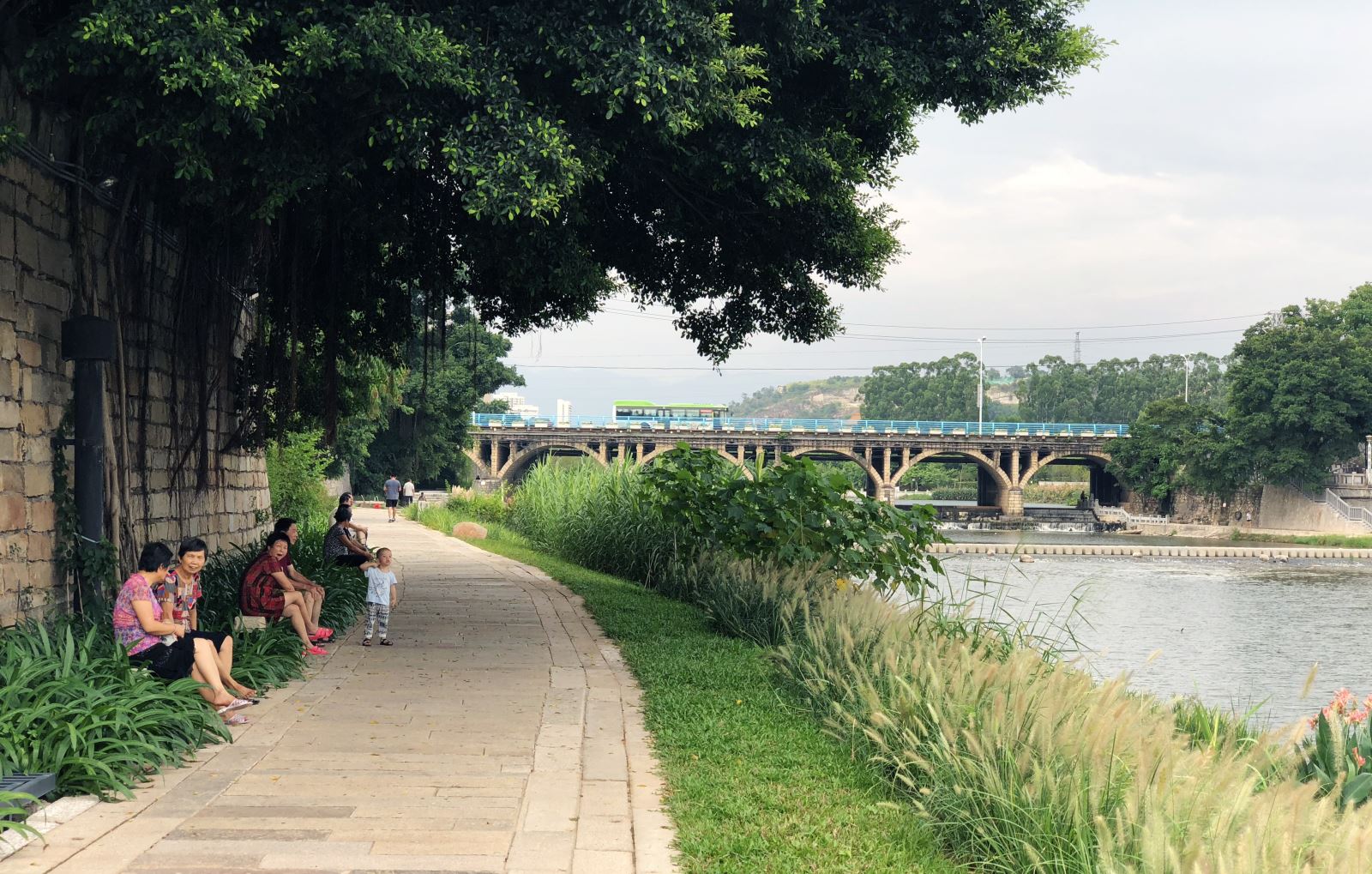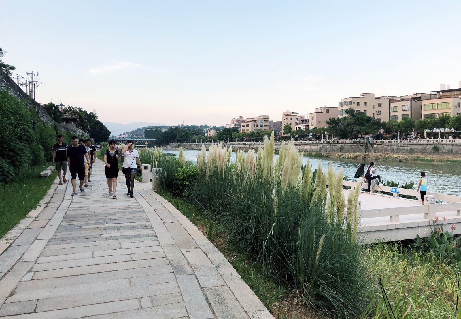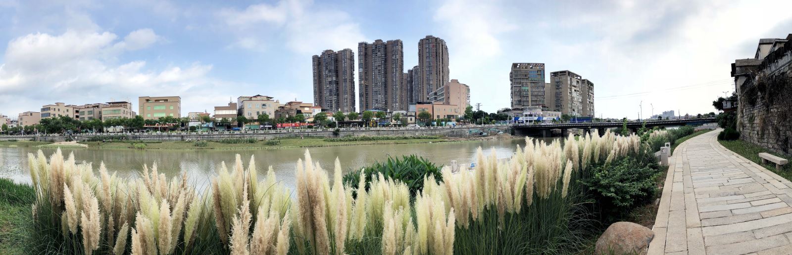 驻足同安南门桥上,眺望古城湿地两岸,岸边的蒲苇随风摇曳,水生美人蕉花儿正艳,岸线的松木桩高低错落,飞鸟低徊翩飞,溪水在卵石汀步上拍打出浪花朵朵,古城湿地两岸,一派人与自然和谐的景象。
