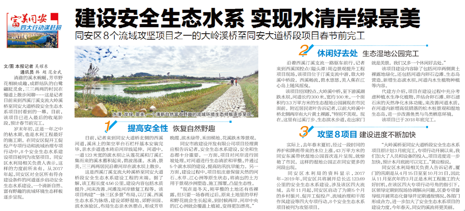 汀溪隘头潭国控点湿地建设工程位于同安西溪上游靠大岭溪中桥段,设计范围起于大岭溪滚水坝,经国控点、大岭溪中桥,至下游溪湖跌水坝,河道长约300米,宽约100米,面积约3.3万平方米。建设内容主要包括岸上两侧黄土裸露地绿化,河道内卵石边滩、生态岛营造,新增生态滚水坝、过溪汀步、生态滨水步道,水生植物种植等内容。