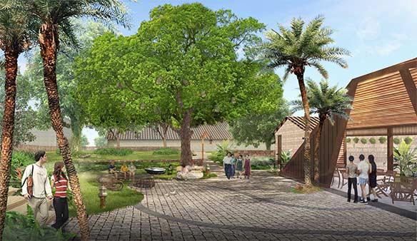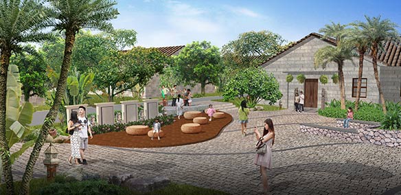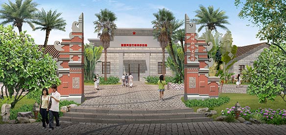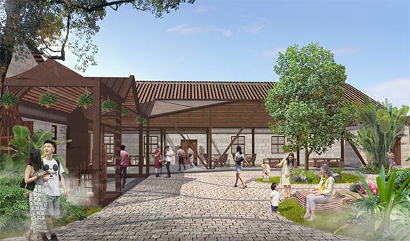 建筑修缮中保留少数原石墙及土质古瓦屋顶结构的老屋老墙,其运用老旧条石、红砖红瓦、木材等具有古朴、带有南洋风情特质的材料修复建筑,致力打造修旧如旧的归侨史迹馆。景观方案中,借鉴建筑条石、红砖红瓦、花砖等选材,与整体建筑相协调呼应,打造质朴、具有南洋风情的配套景观。