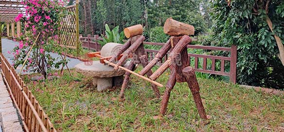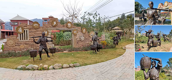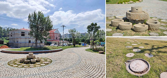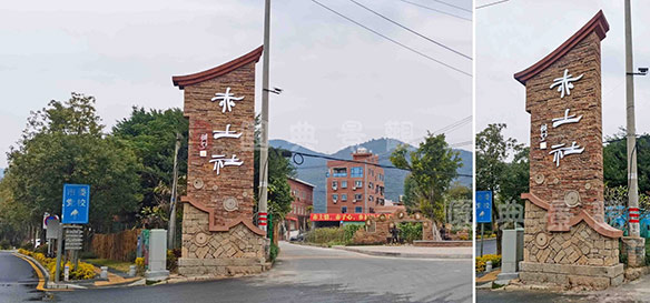 村口公园设计采用旧石磨和旧砖瓦堆砌独具乡土特色的村口铭牌,如今从天竺山路路过,远远的就能看到“赤土社”铭牌,夜晚“赤土社”三字亮起,既点亮了回乡的路,也点亮了赤土社乡村振兴。