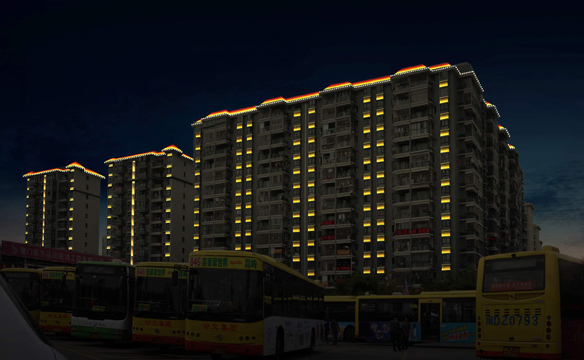 本次金湖路沿街建筑夜景亮化,遵循整体和谐、局部凸显的亮化原则。重点照明光污染较小的建筑顶部,点、线、面结合勾勒美观的建筑轮廓,重点墙面及构件用洗墙灯打亮。突出建筑的层次,展现空间结构,同时兼顾色温及照度,有效控制光污染。