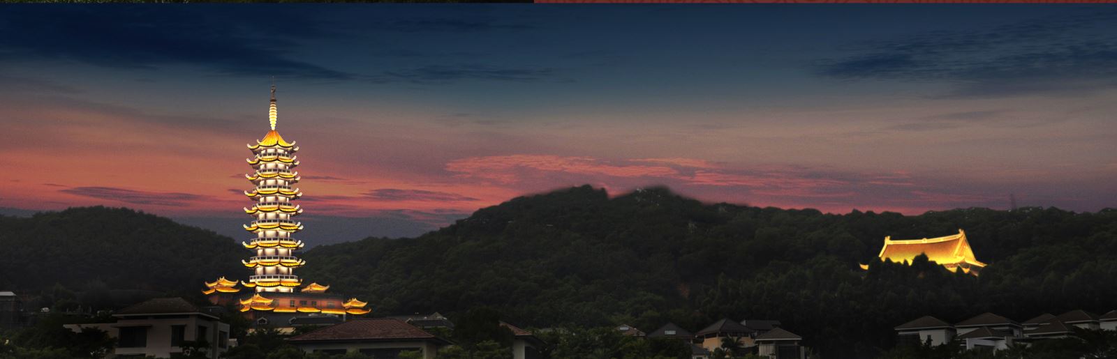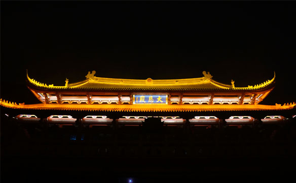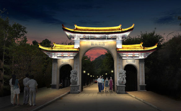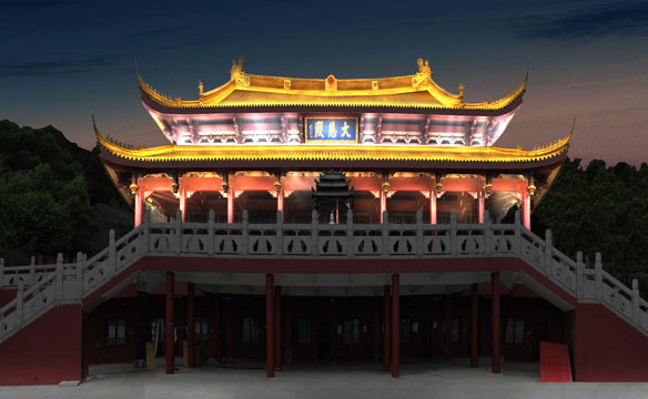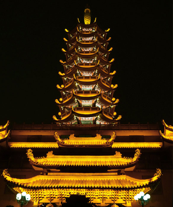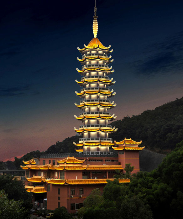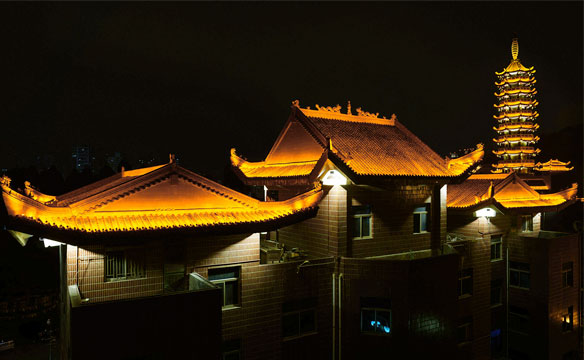 项目中如何有效、恰当亮化佛塔、大悲殿,控制光污染,同时兼顾“建筑美与人文美”是设计的关键。我们在设计中遵循“突出主题、突出重点、凸显特色、以人为本、杜绝光污染、人文艺术与工程技术相结合”的设计原则,采用点、线、面结合,以暖光源为主,营造舒适的景观环境。观音寺灯光亮化体现虚实结合及禅宗意境美。万佛宝塔分塔顶、塔身、裙楼,通过对建筑瓦屋面统一照亮,上下贯穿,最顶部重点打亮,裙楼隐秘山林。塔身石栏杆和飞檐做灯光控制处理。大悲殿夜间人流较少,与五佛宝塔距离较近,防止过度亮化对万佛宝塔光污染,灯光照明尽量弱化,只做瓦屋面照明,利用LED瓦楞灯,均匀将金色屋面洗亮。真正展示出“盛世辉煌,佛光普照”的宏伟气魄。
