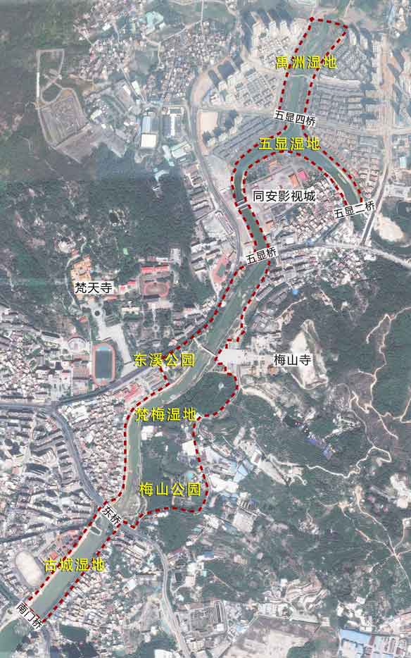 在“以水为轴、连点成线、画线成片”的构思下,在城区河段采用“安全为主、生态为辅”的建设方案,对河水、河床、河滩、河岸进行生态措施技术处理,现东溪多处湿地已串联成片,组成同安最大的带状湿地公园,面积约43万平方米,生态修复效果已跃然而出,青草飘摇、花树成荫、清波渺渺,移步换景,景色怡人。东溪水系把同安古城(一城),梵天寺以及梅山寺(两寺)、双溪公园、东溪公园、梅山公园、禹洲湿地公园(四公园)囊括其中,并联结禹洲湿地、五显湿地、梵梅湿地、古城湿地形成同安最大的带状湿地公园,最终实现了“我家就在湿地公园”美好愿景。