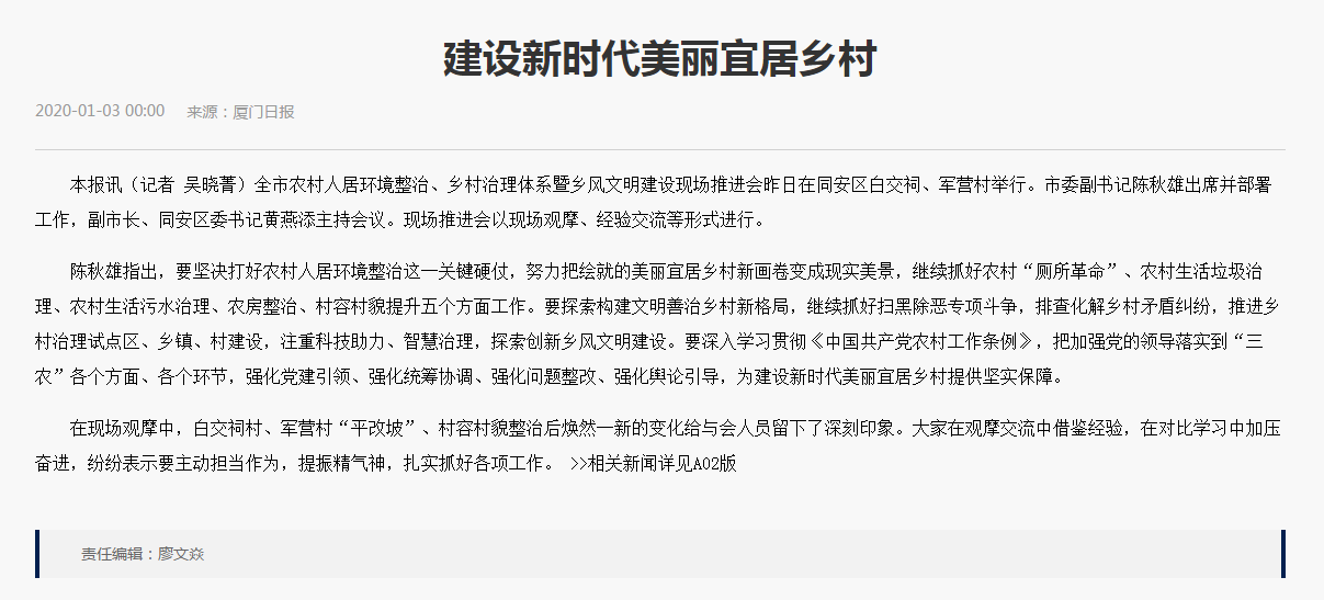2020年1月2日,厦门市农村人居环境整治、乡村治理体系暨乡风文明建设现场推进会在同安区白交祠、军营村举行。市委副书记陈秋雄出席并部署工作,副市长、同安区委书记黄燕添主持会议。现场推进会以现场观摩、经验交流等形式进行。在推进会现场观摩中,军营村、白交祠村村容村貌整治后焕然一新的变化给与会人员留下了深刻印象。陈秋雄指出,要坚决打好农村人居环境整治这一关键硬仗,努力把绘就的美丽宜居乡村新画卷变成现实美景!